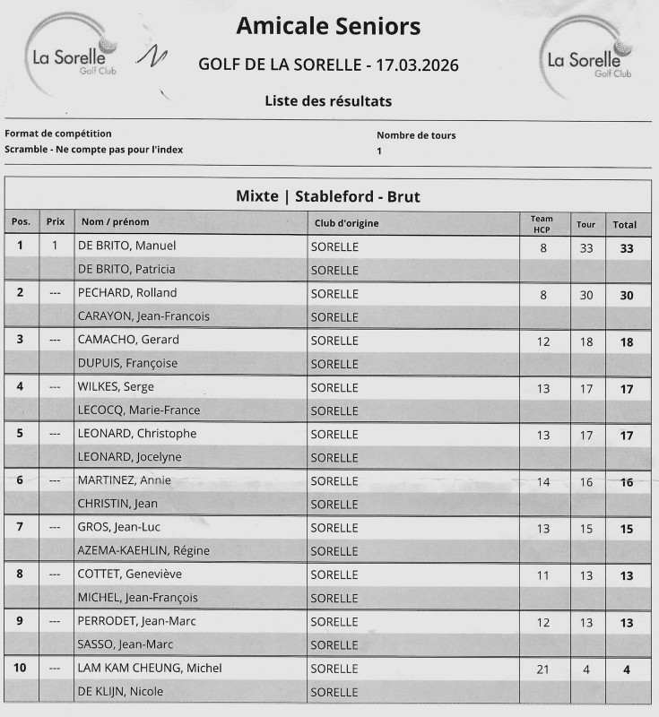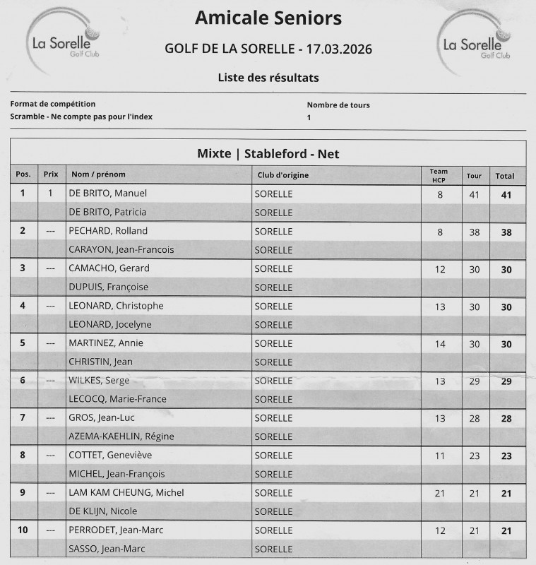 AMICALE du mardi 17 mars (scramble à 2, 18 trous)